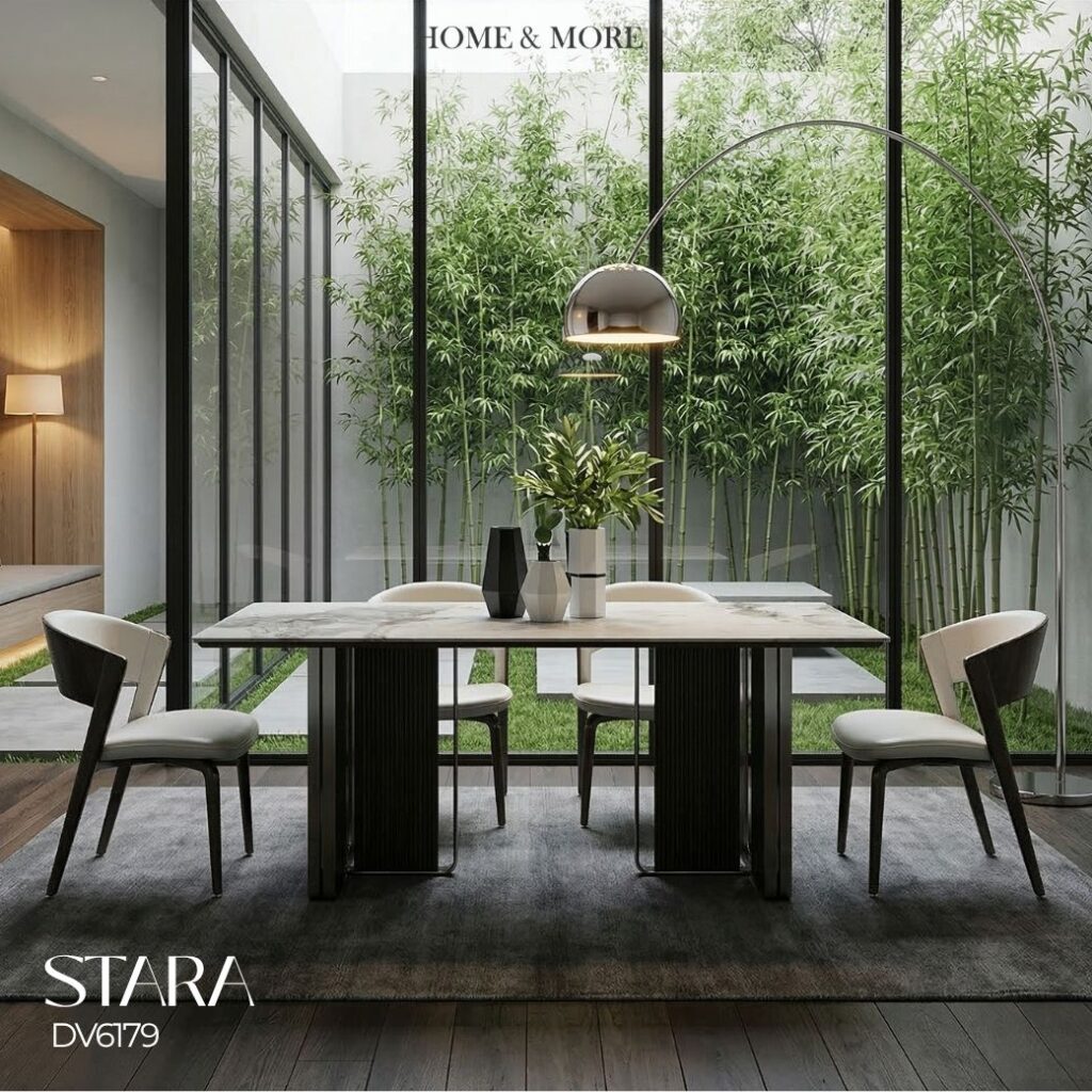 โต๊ะอาหารรุ่น STARA ให้ความรู้สึกโปร่ง สบาย ด้วยท็อปสีอ่อนลายหิน เพิ่มความละมุนตา ตัดกับฐานสีเข้มดีไซน์มีเส้นลูกเล่น ช่วยเติมมิติให้พื้นที่ดูน่าสนใจ เหมาะกับบ้านสไตล์โมเดิร์นที่เน้นแสงธรรมชาติ และบรรยากาศผ่อนคลาย ให้ทุกมื้อดูเรียบง่าย…แต่ยังคงความหรูอย่างมีรสนิยม