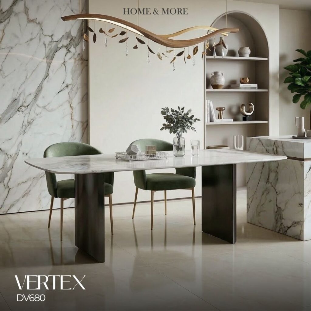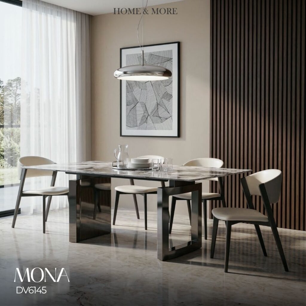 โต๊ะอาหารรุ่น MONA โดดเด่นด้วยดีไซน์ฐานทรงเรขาคณิต ที่ให้ความรู้สึกโมเดิร์นและมีเอกลักษณ์ จับคู่กับท็อปลายหินโทนอ่อน ช่วยบาลานซ์ลุคให้ดูอบอุ่น นุ่มนวล แต่ยังคงความหรู เหมาะกับบ้านที่ต้องการความเรียบง่ายแบบมีดีไซน์ ดูสบายตา แต่มีรายละเอียดที่ทำให้ “แตกต่างอย่างมีระดับ”