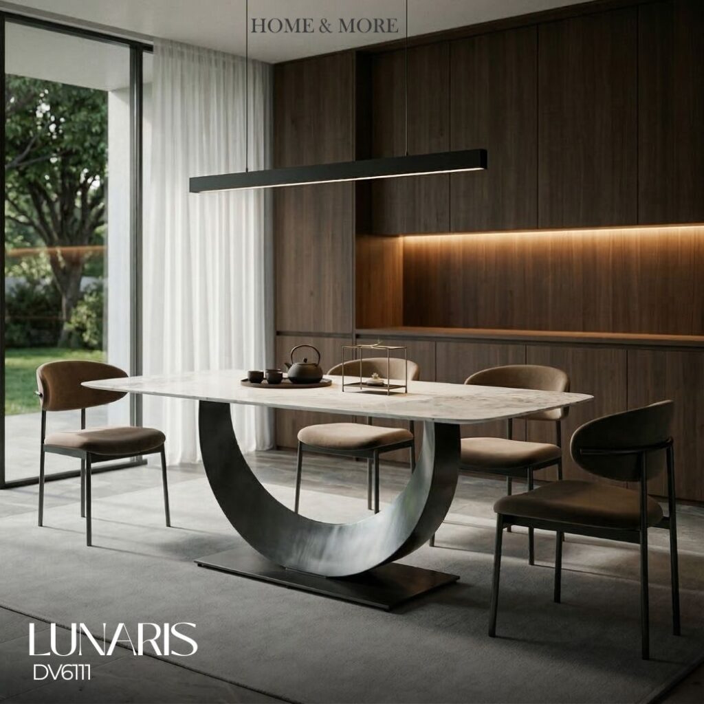 โต๊ะอาหารรุ่น LUNARIS โดดเด่นด้วยฐานทรงโค้งคล้ายพระจันทร์ เสริมลุคให้ดูมีเอกลักษณ์และสะดุดตา ตัดกับท็อปลายหินโทนอ่อน ช่วยบาลานซ์ดีไซน์ให้ดูหรูแต่ไม่หนักจนเกินไป เหมาะสำหรับคนที่ต้องการ “Statement Piece” ในห้องอาหาร เติมความโมเดิร์น หรู และมีดีไซน์ที่แตกต่างอย่างชัดเจน