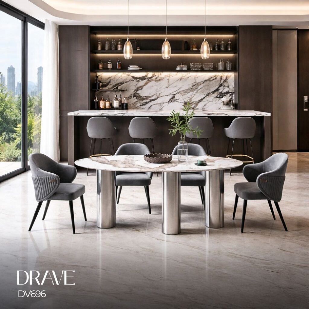 โต๊ะอาหารรุ่น DRAVE ทรงวงรีสไตล์ Modern Luxury ผสานความเรียบหรูและความทันสมัยอย่างลงตัว ท็อปหินลายธรรมชาติให้ความรู้สึกพรีเมียม โดดเด่นด้วย ขาโต๊ะทรงกระบอก จัดวางอย่างมีจังหวะ เพิ่มมิติให้ดีไซน์ดูโปร่ง โล่ง แต่ยังคงความแข็งแรง พร้อมผิวสเตนเลสที่สะท้อนแสงอย่างนุ่มนวล ยกระดับบรรยากาศพื้นที่รับประทานอาหารให้ดูหรูมีระดับมากยิ่งขึ้น